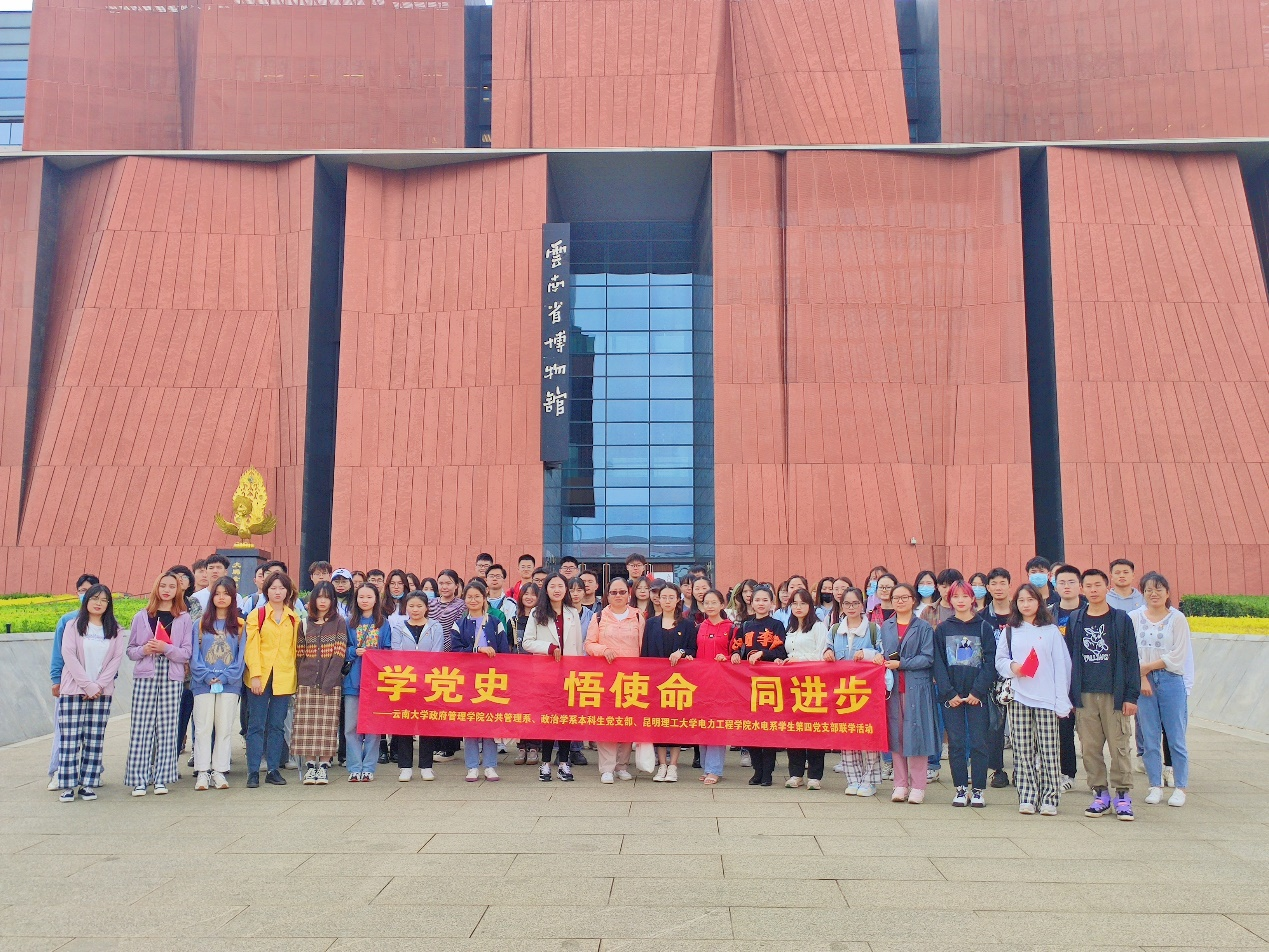为认真贯彻党中央、省委、公司党委及公司党委关于开展“两学一做”教育活动工作精神、深入学习习近平总书记考察云南时的重要讲话、深入学习云南省党的百年发展史,扎实推进党史学习教育。3044永利集团公共管理系本科生党支部、政治学系本科生党支部与昆明理工大学电力工程公司水电系员工第四党支部5月27日在云南省博物馆开展了“学党史 悟使命 同进步”联建共学主题党日活动。
