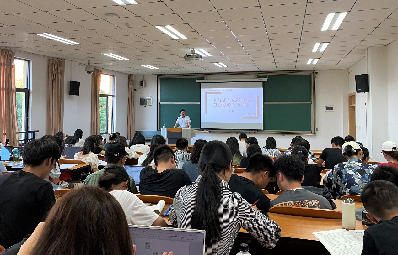 公共事业管理本科生罗同学是今年新发展的入党积极分子,在讲座过程中,他全神贯注地听讲,并不断做笔记。他说:“今晚的讲座很精彩,既有思政的性质,又有学术讲座的风格。那么多珍贵的中外文材料,真让我大开眼见!段老师用新史料让共和国的历史呈现得如此立体,如此生动,让我越发认识到我们党的伟大和坚强。我要更加坚决地向党靠拢,争取早日加入这个光荣的集体”。