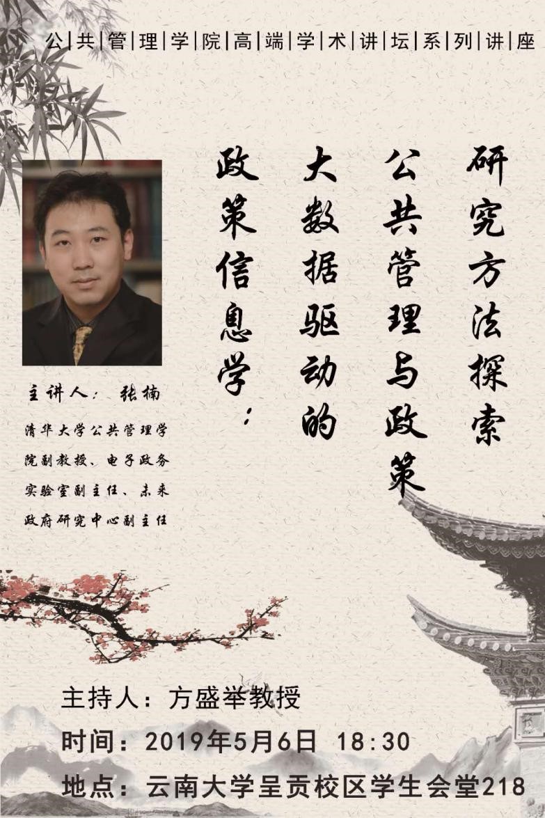2019年5月6日18:30公共管理公司高端学术论坛系列讲座在3044永利集团呈贡校区员工会堂218举办。本次讲座由清华大学公共管理公司副教授、电子政务实验室副主任、未来研究中心副主任张楠教授主讲,主题为《政策信息学:大数据驱动的公共管理与政策研究方法探索》。讲座由公共管理公司经理方盛举教授主持,公司相关教师和二百余名同学到现场聆听张楠教授的讲座。