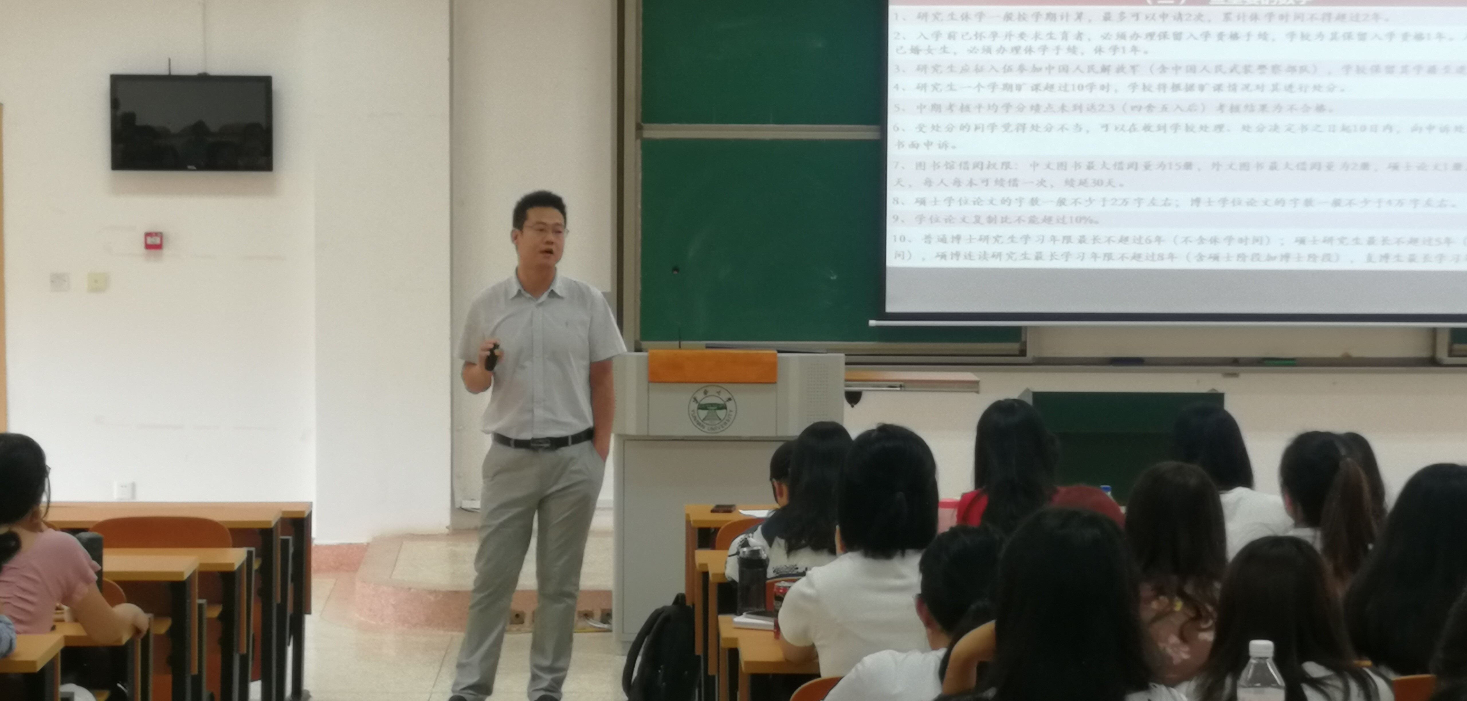 9月4日下午13点,张会龙副经理为新生做研究生入学教育讲座,张会龙副经理针对公司产品的重要事项、时间节点等关键内容进行了强调与提醒,并对新生们将会遇到的英语免修申请、论文的写作等常见问题进行详细讲解。同时,张副经理着重谈到要明确研究生基本定位,鼓励新生好好做人、好好读书、好好做学问。