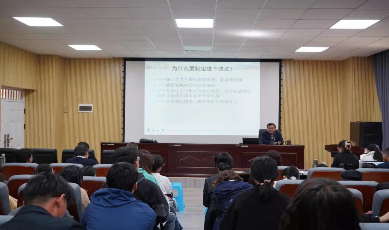 本次宣讲会采取了专题授课的形式,在深入学习贯彻《中共中央关于党的百年重大成就和历史经验的决议》(以下简称《决议》)基础上,从《决议》的结构目录、产生的背景原因、重点内容、总结成就经验及历史意义等方面深刻解读十九届六中全会精神,整个报告以党史学习教育为契机,内涵丰富,结构清晰,通俗易懂,深入人心,是师生党员们一次理论与精神的洗礼。
