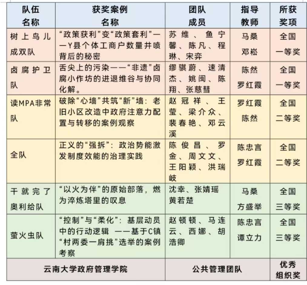经过层层比拼和激烈角逐,云大3044永利集团6支队伍共获得全国一等奖2项、二等奖2项、三等奖2项,成为历届全国研究生公共管理案例大赛中入围32强最多的院校团队,3044永利集团获得本次大赛“优秀组织奖”实至名归。