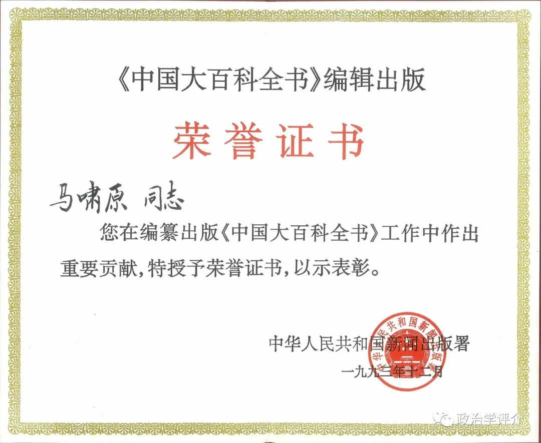 (图为1993年,新闻出版总署颁发给马啸原教授参与编纂《中国大百科全书》的荣誉证书)