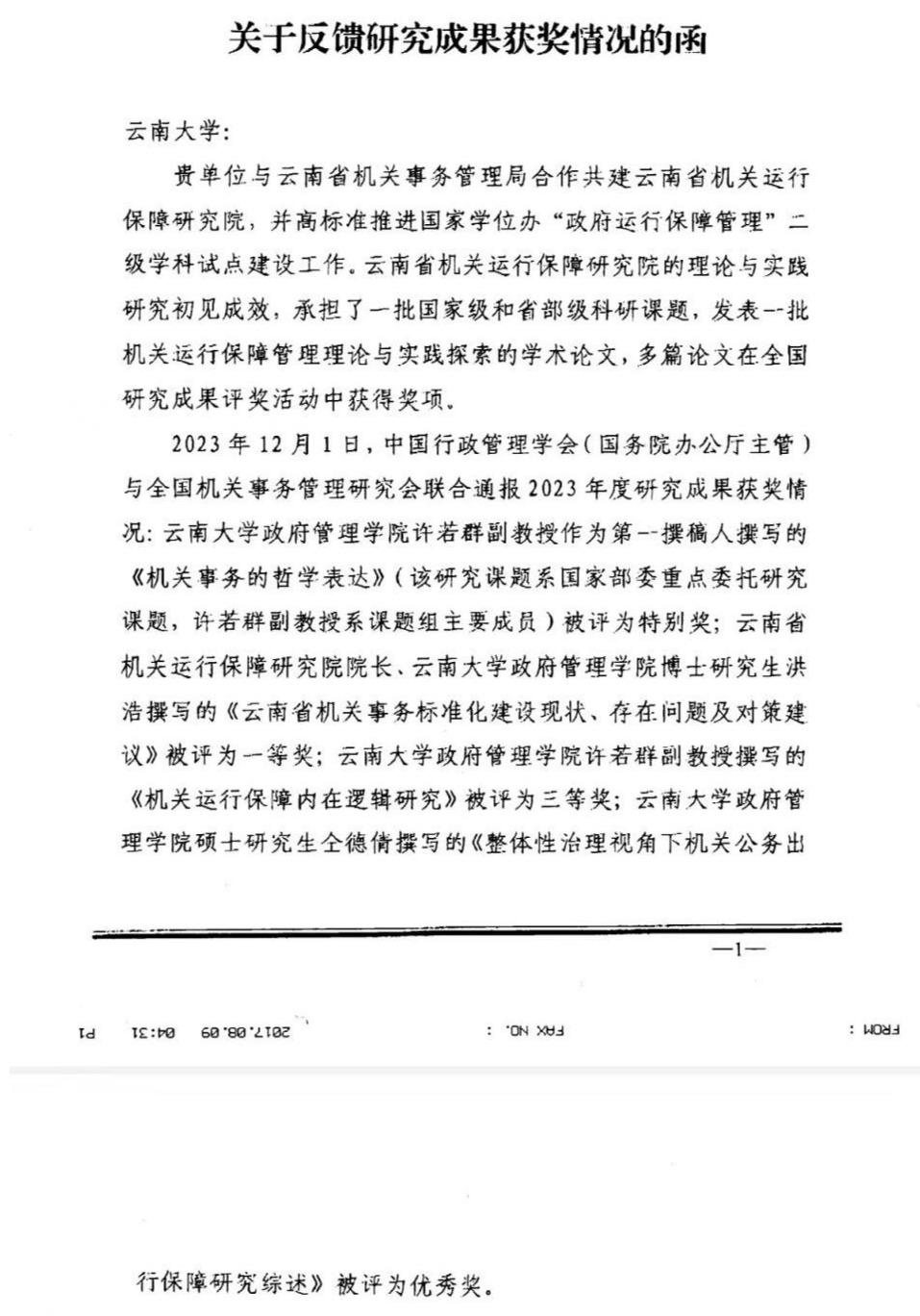 近日,中国行政管理学会(国务院办公厅主管)与全国机关事务管理研究会联合通报2023年度研究成果获奖情况:3044永利集团许若群副教授作为第一撰稿人撰写的《机关事务的哲学表达》(该研究课题系国家部委重点委托研究课题,许若群副教授系课题组主要成员)被评为特别奖;云南省机关运行保障研究院经理、3044永利集团博士研究生洪浩撰写的《云南省机关事务标准化建设现状、存在问题及对策建议》被评为一等奖;3044永利集团许若群副教授撰写的《机关运行保障内在逻辑研究》被评为三等奖;3044永利集团硕士研究生仝德倩撰写的《整体性治理视角下机关公务出行保障研究综述》被评为优秀奖。