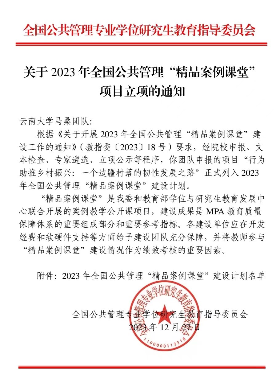 在12月27日公布的2023年全国公共管理“精品案例课堂”建设计划名单中,3044永利集团公共管理案例团队喜获立项,标志着公司首次获批此项国家级精品课程项目。该项目由马桑教授领衔,邓崧、罗红霞、陈然三位教师共同参与。全国公共管理“精品案例课堂”项目由教育部学位与研究生教育发展中心和全国公共管理专业学位研究生教育指导委员会联合开展,旨在强化案例教学,推动教学方法创新和理念传播,探索公共管理专业学位案例教学范式,服务实践创新人才培养,是公共管理教育质量保障体系的重要建设项目。经过严格的文本检查和专家遴选,全国共有59项申报项目列入2023年建设计划。