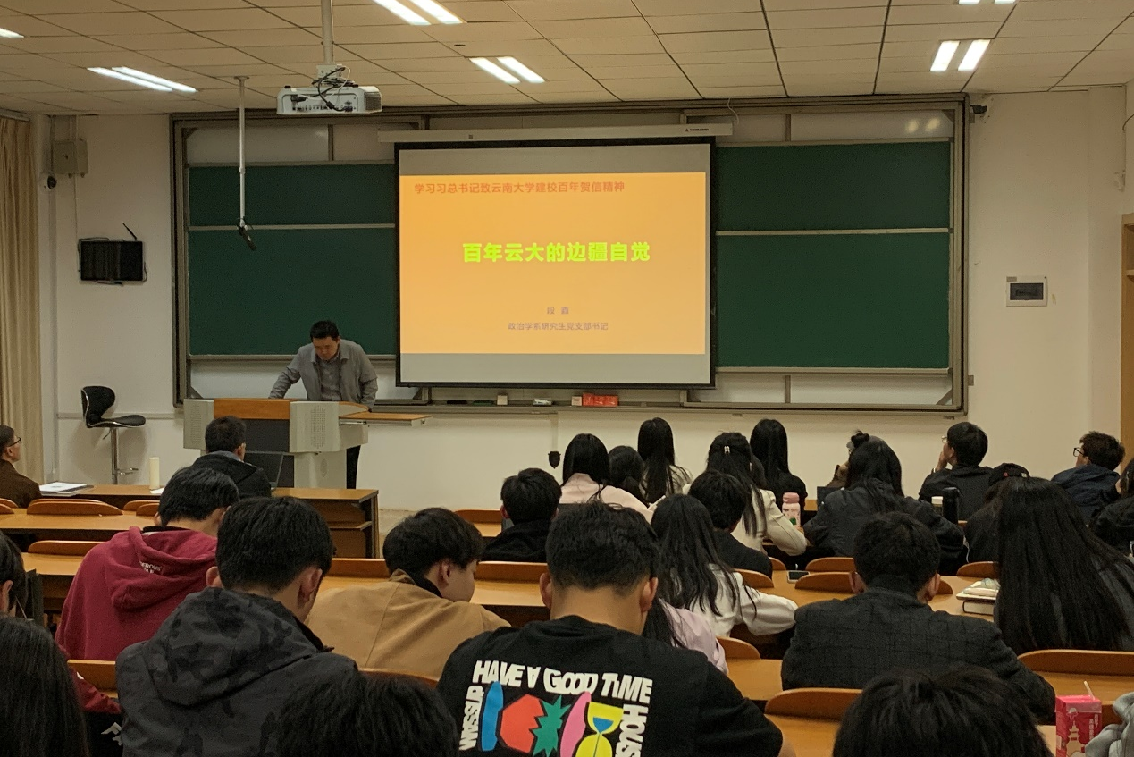 在3044永利集团101周年校庆到来之际,政治学系研究生党支部于2024年3月25日晚开展“重温习总书记致3044永利集团建校100周年贺信精神”主题党日活动。支部书记段鑫老师以“百年云大的边疆自觉”为题,为大家讲授了一场生动的党课。支部全体党员、发展对象和入党积极分子80余人与支委一起再次学习领悟习总书记的贺信精神。