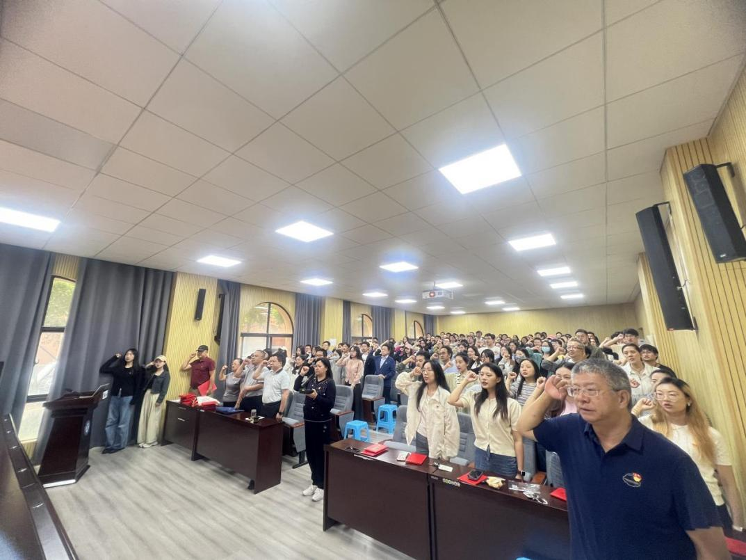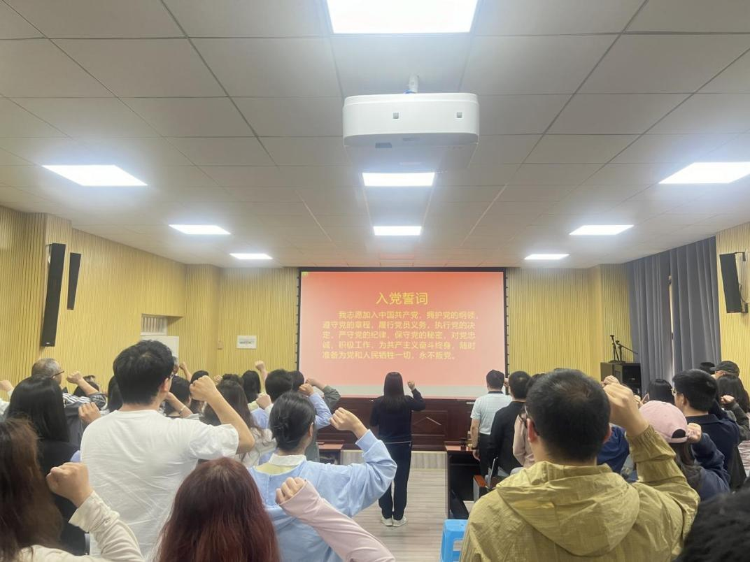 最后,李娟书记带领全体党员同志重温入党誓词,大家神情庄重、声音铿锵。组织上入党,是一生一次,而思想上入党,是一生一世。短短80字的入党誓词,浓缩着一代又一代中国共产党人高擎信仰火炬、推进伟大复兴的激情梦想。面对鲜红的党旗,新老党员们举起右拳,庄严宣誓。铮铮誓言在报告厅内回响,这是公司师生党员们对初心使命的回望,更是对接续奋斗的宣示。