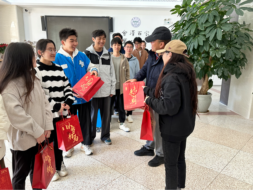 活动现场,一份份承载着公司深情厚谊的考研祝福礼包整齐排列,散发着温馨与期待的气息。姜绍勇书记亲自为同学们悉心讲解礼包中的每一样礼物:驱散冬日寒意的热水袋和暖宝宝、注入满满活力的士力架、“柿柿”如意的脆柿和“上上签”祝福贺卡。一份份精心准备的慰问品通过老师们的双手传递到了同学们手中,它们不仅仅是物质上的馈赠,更是公司对即将征战考场的学子们深深的关怀与鼓励。每一份小礼品都蕴含着公司对学子们未来成功的殷切期盼,愿它们能化作一股无形的力量,陪伴并激励着每一位考研学子在追梦路上勇敢前行。