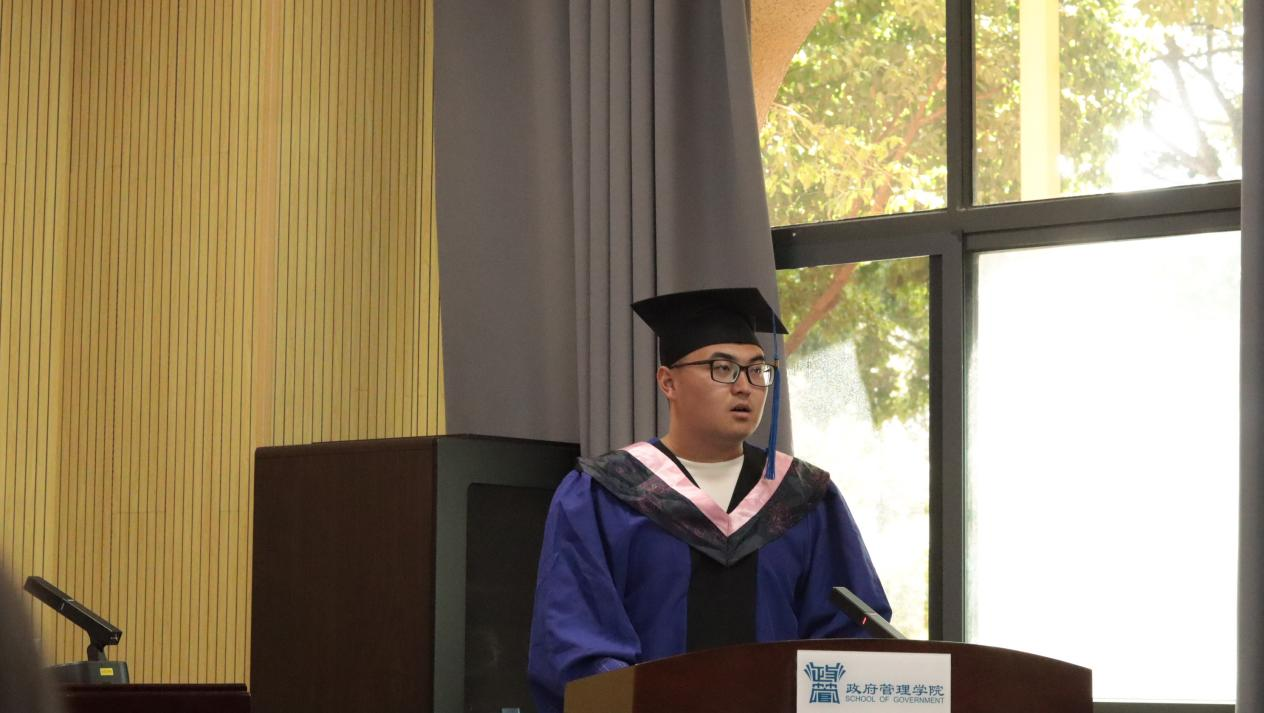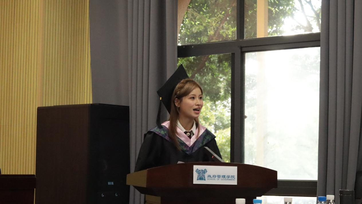 2021级本科生政治学与行政学专业李雨诺、2022级公共管理专业丁一、2022级科学硕士刘丕金、2021级博士研究生孙浩然分别上台,回顾求学时光、求学所获,表达对师长的感恩与对未来的期许。2021级本科生王中天的家长符小慧女士作为家长代表,深情感谢公司的培养,并祝愿所有毕业生前程似锦。