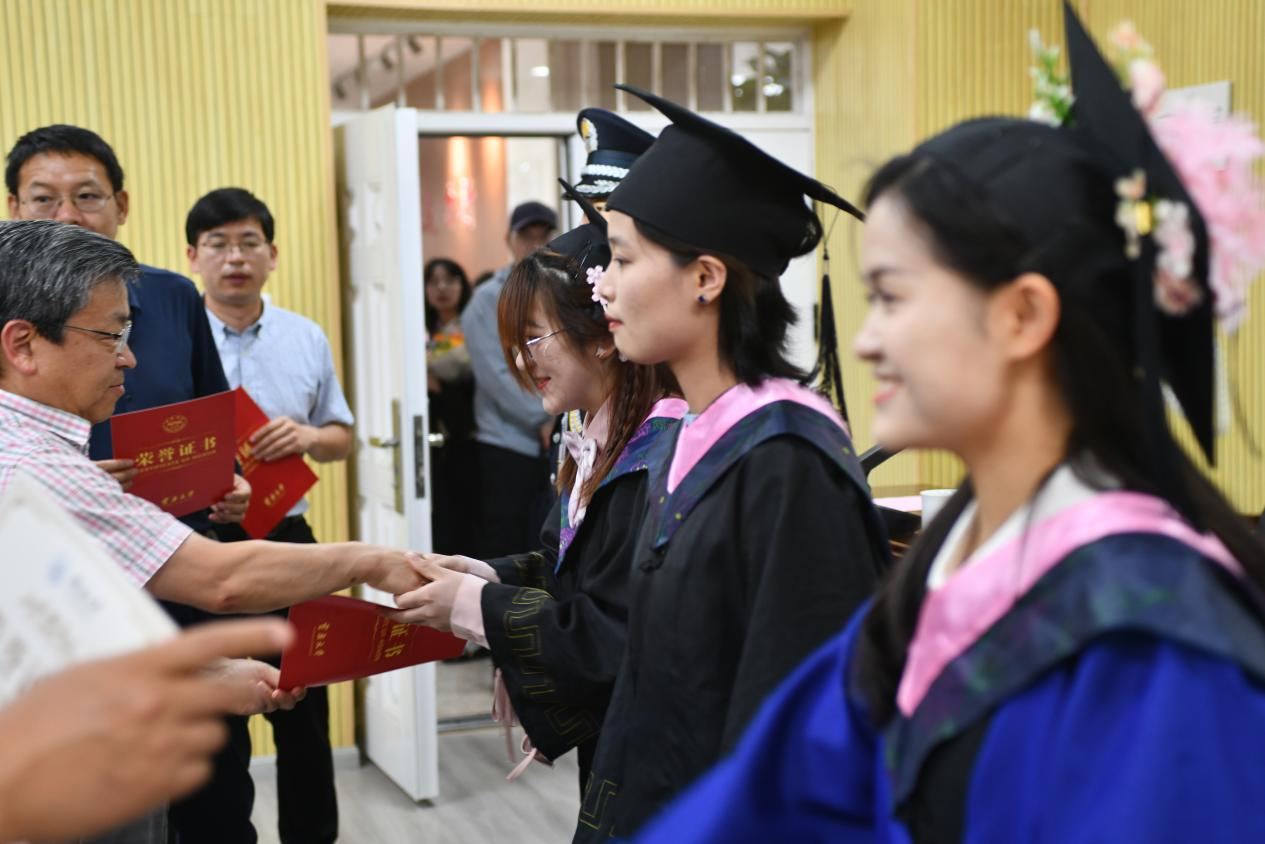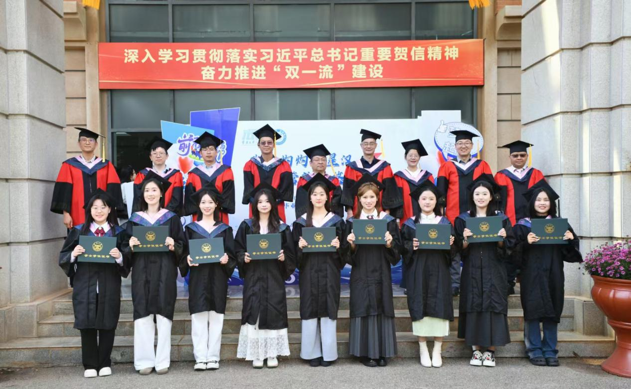 在2025届毕业生学位授予仪式上,公司学位分委员会委员为毕业生授予学位证书并拨穗留念。