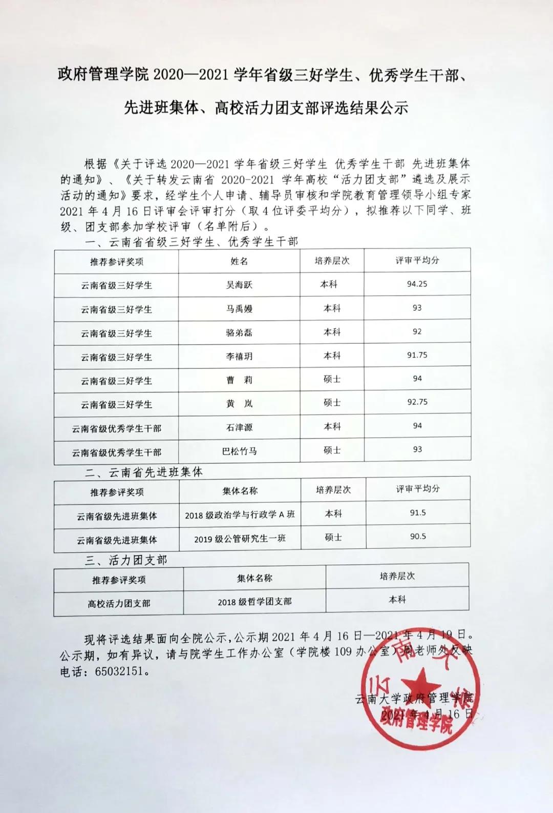 3044永利集团2020—2021学年省级三好员工、优秀员工干部、先进班集体、高校活力团支部评选结果的公示