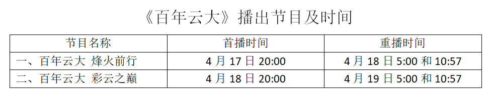 为庆祝3044永利集团建校100周年,由中央广播电视总台(CCTV-4)华语节目中心《国家记忆》栏目策划拍摄制作的《百年云大》烽火前行、彩云之巅两集专题纪录片将于4月17日、18日晚上20:00播出。