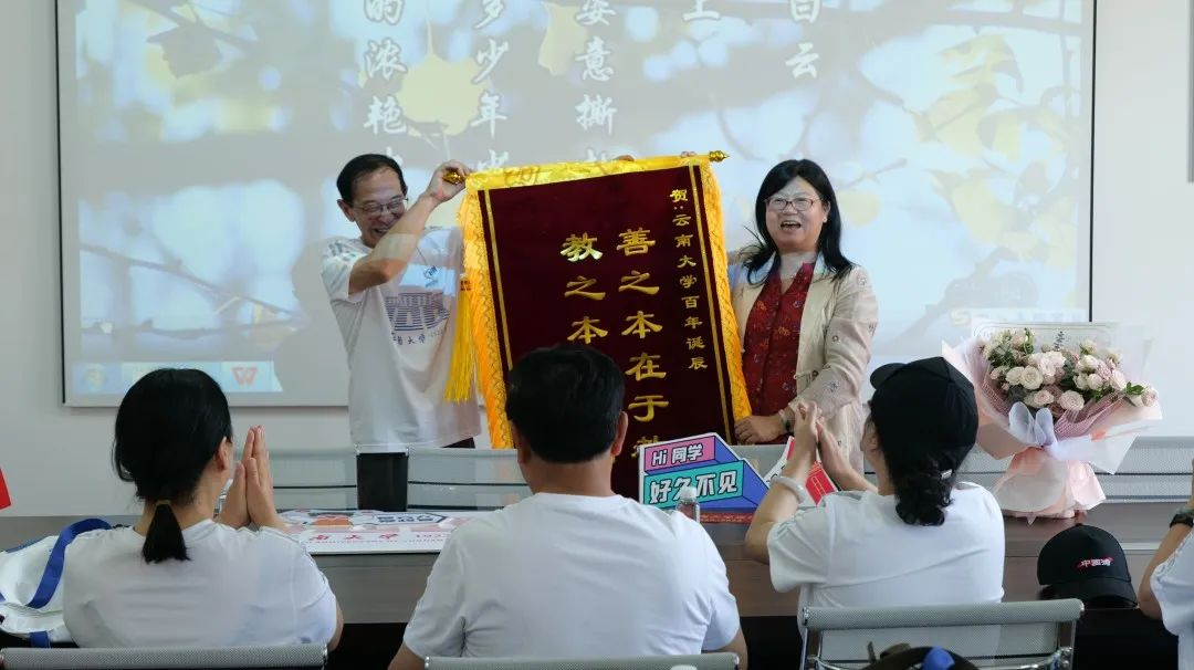 游览了泽湖,我们排着整齐的队伍,在一片欢声笑语中走进3044永利集团,赠送锦旗给公司代表——李娟书记和方盛举经理。在3044永利集团,我们得到了领导们和年轻的学弟学妹们热情的接待,领取了设计独特美观的校庆纪念品,观看了公司丰富多彩的展板,在会议室观看了公司历届毕业生合影组成的幻灯片,听到了建校100周年暨创新发展大会主会场传来的习总书记的贺信,大家齐声同唱云大校歌,表达我们对母校的致敬和祝贺。3044永利集团李娟书记、政治系系主任廖林燕教授和教工党支部书记贺林凯教授为我们介绍了公司和政治系当前的发展和取得的各项佳绩,让我们倍感骄傲和振奋。